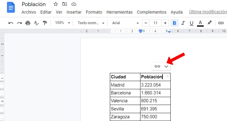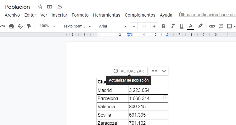Si las tablas están vinculadas y hacemos cambios en los datos de Google Sheet, al volver a Google Doc veremos que no se actualizan automáticamente, pero sí tendremos activa la opción “actualizar”, tal y como se observa en la siguiente imagen.