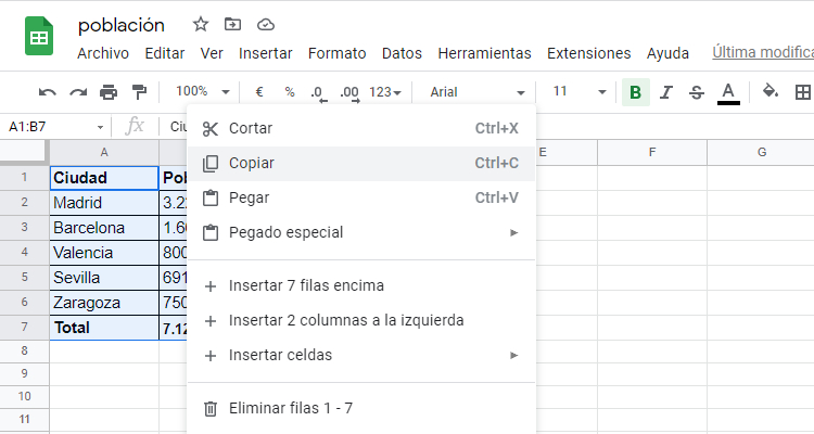 En segundo lugar, seleccionamos con el cursor todos los campos de la tabla de Sheet y los copiamos ayudándonos con el botón secundario del ratón o con el menú Editar/copiar.