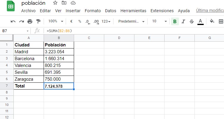 Lo primero que tenemos que hacer es crear una tabla con los datos que necesitamos en una hoja de Sheet. Vamos a trabajar con un ejemplo sencillo que incluye una columna con el nombre de la ciudad y otra columna con la población. Al final de la tabla, hay una fila con el total con una función de suma.