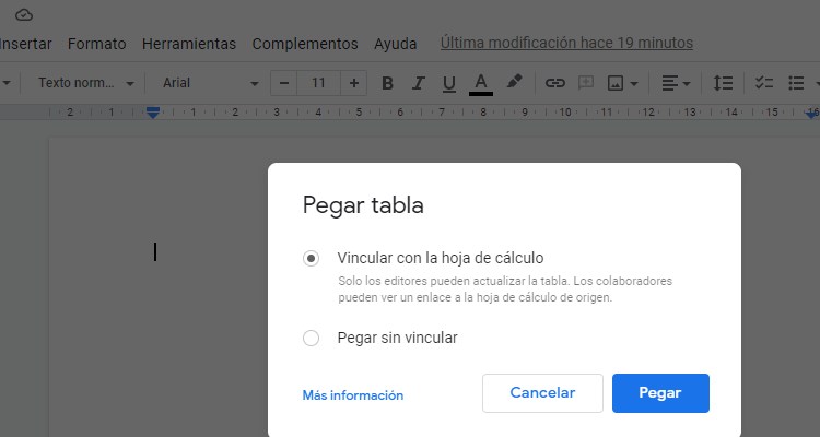 A continuación, vamos al documento de Google Docs y pinchamos donde queremos pegar la tabla. Nos preguntará si queremos que se vincule a la hoja de cálculo. Si queremos que así sea, para que se actualicen los datos automáticamente, pinchamos en “vincular.”